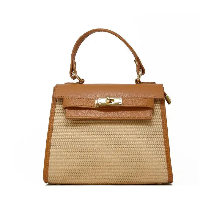 Raffia and Leather Top Handle Crossbody Bag in Camel