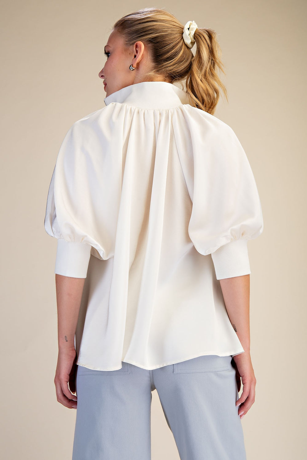 Standing Collared Puff Shoulder Solid Top in Red
